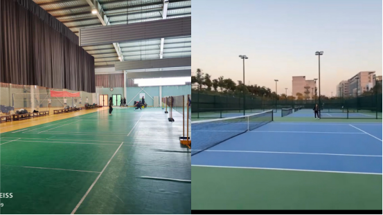 地点:学校体育北馆:3个室内羽毛球场地,3个露天网球场地