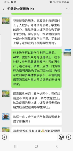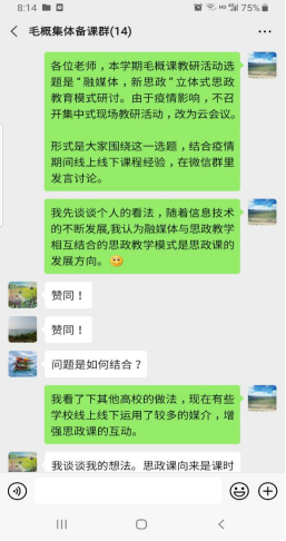 为了贯彻落实习近平总书记在学校思想政治理论课教师座谈会上的重要讲话和习近平总书记在全国高校思想政治工作会议上的讲话精神,不断推进思想政治理论课与信息技术高度融合,结合疫情期间线上课程的创新实践,毛概教研室本学期的教研活动聚焦于“融媒体,新思政”立体式教育模式。由于疫情防控要求,第11周,毛概教研室老师采取云会议形式,围绕着如何构建网络思政课程体系开展了热烈讨论。
