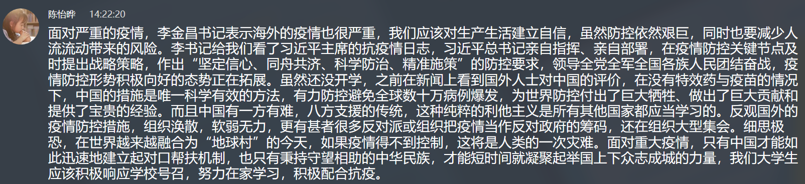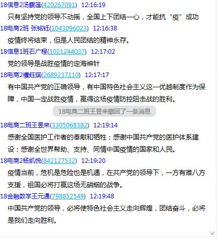一个小时的公开课上,李书记例举了大量案例、数据,内容详实、深入浅出,还分别就每个话题与同学们互动交流、循循善诱,为我校大学生上了一堂厚植爱国主义情怀的疫情思政课。李书记的公开课在师生间引起热议,在教师的组织下学生对比了中外政治制度的差异,对我国社会主义制度的优越性进行深入讨论;师生共同回顾100多年来中华民族谋求解放的艰辛历史,思考讨论了蕴藏在伟大人民间的中国精神和中国力量。