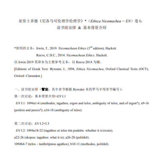 伦理学专业的同学们对于《尼各马可伦理学》已有涉猎,魏老师为了让大家对亚氏的哲学精神以及其伦理学体系有更深的理解,带领大家精读英文版,并为大家推荐了用于入门的导论性读物,在每次读书会之前还为大家发送了自做的阅读思考材料以及读书安排,一方面使大家对读书会安排清晰明了,另一方面也在耳濡目染中传递给了大家严谨的做事态度。
