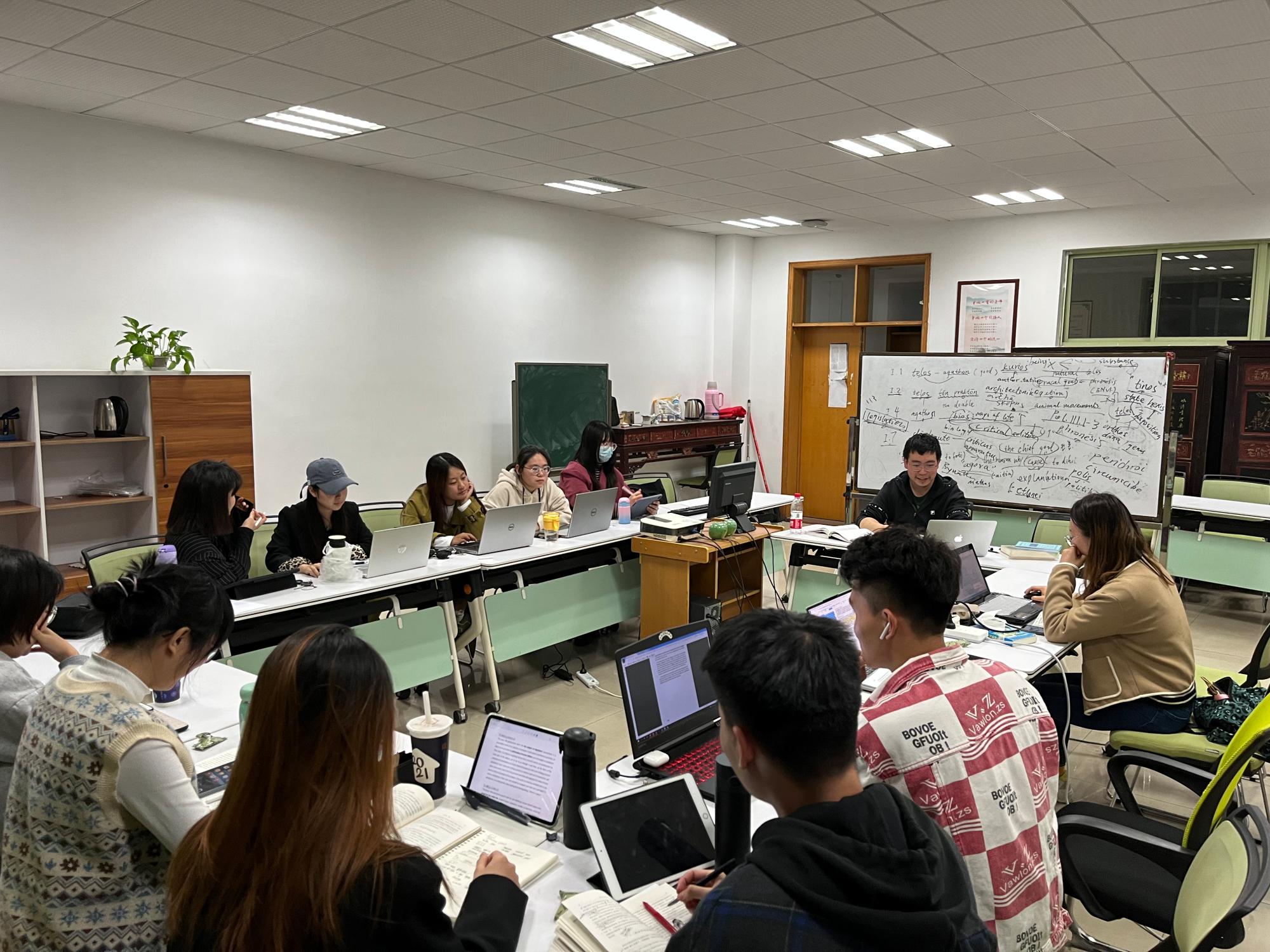 20级、21级伦理学专业研究生每周二的晚上7:30准时相聚在3号楼206伦理学教研室。大家谈笑风生、轻松自在地享受着由魏梁钰老师主持的有关亚里士多德哲学的读书会活动。